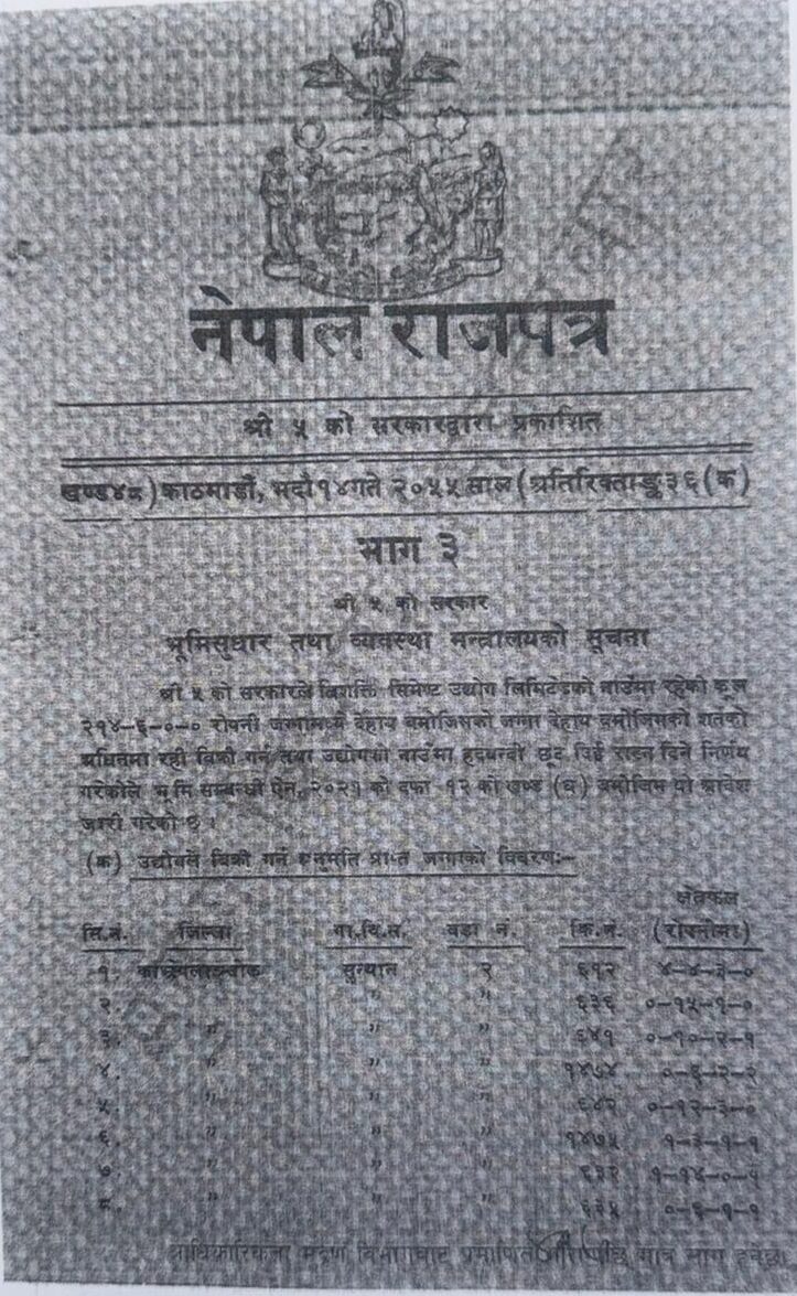 A copy of the Gazette notice on the Council of Ministers’ decision to release Trishakti Cement land for sale