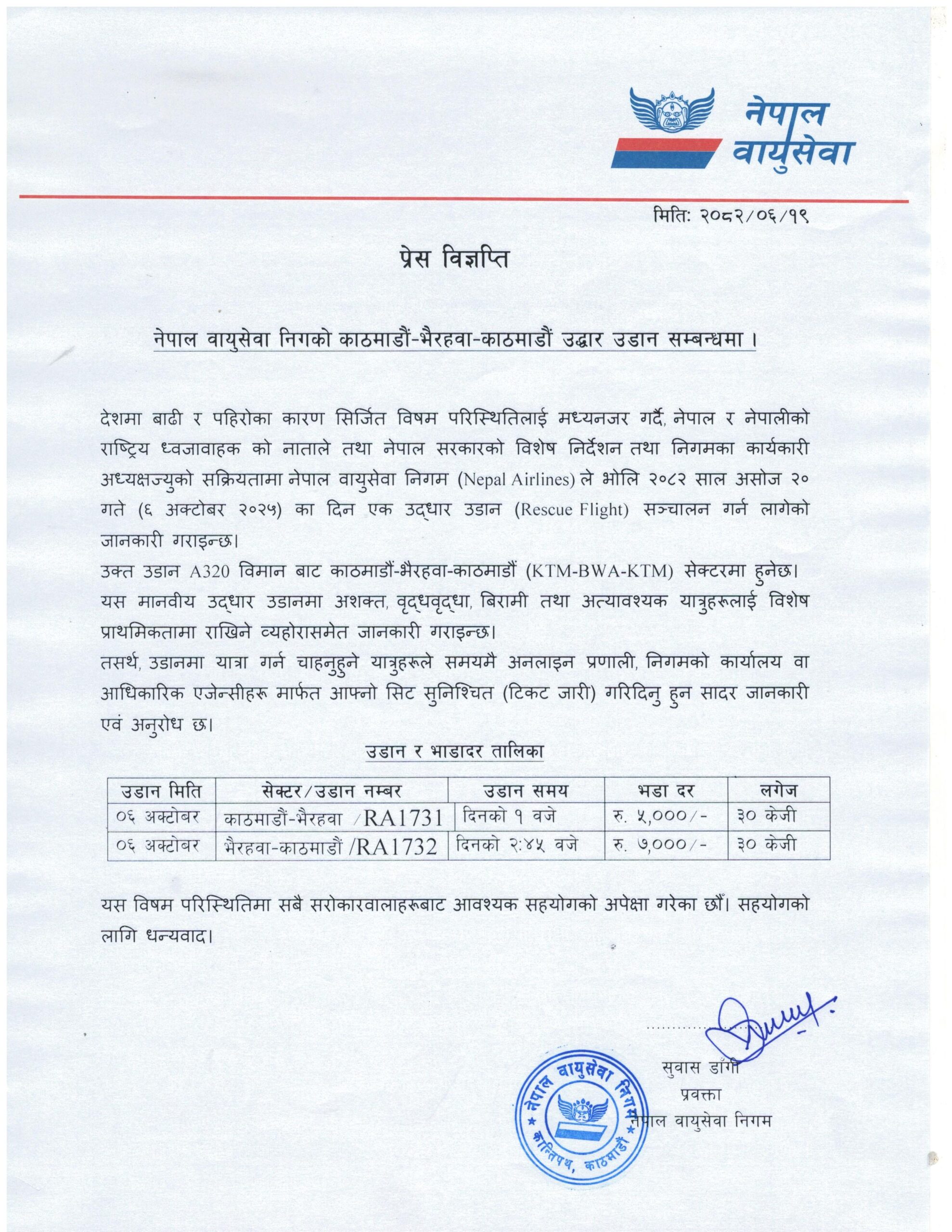 The Airbus will depart from Kathmandu at 1:00 pm and return from Bhairahawa at 2:45 pm.