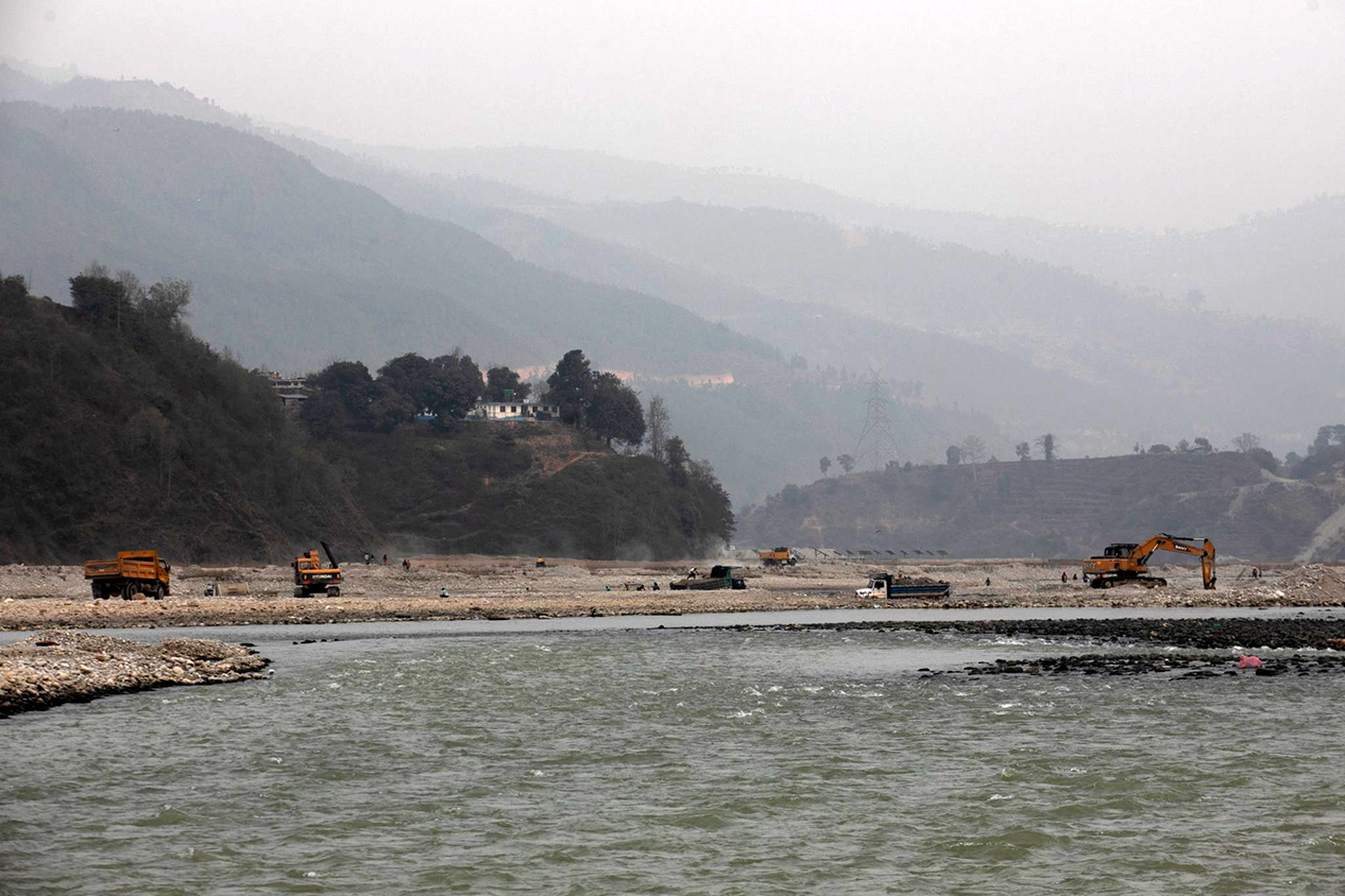 Construction materials being extracted from the Indrawati River in Sindhupalchowk district. Photo: Bikram Rai/Nepal News