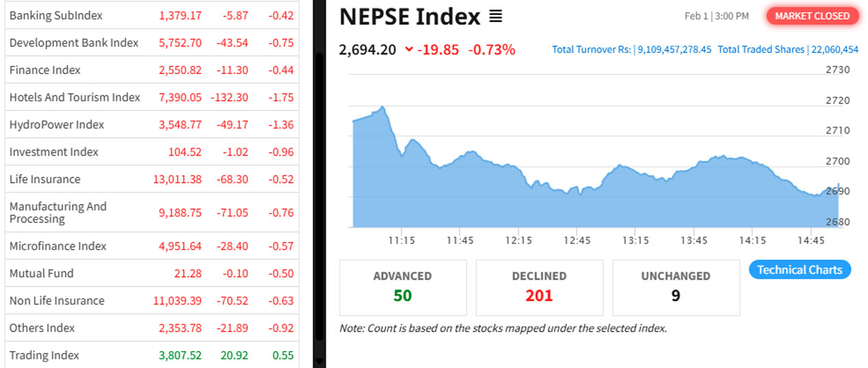 Today, the NEPSE index decreased by 19.85 points to settle at the 2,694.20 level. According to NEPSE, 22,060,454 shares of 329 companies were traded 110,728 times, resulting in a total turnover of Rs 9.109 billion.