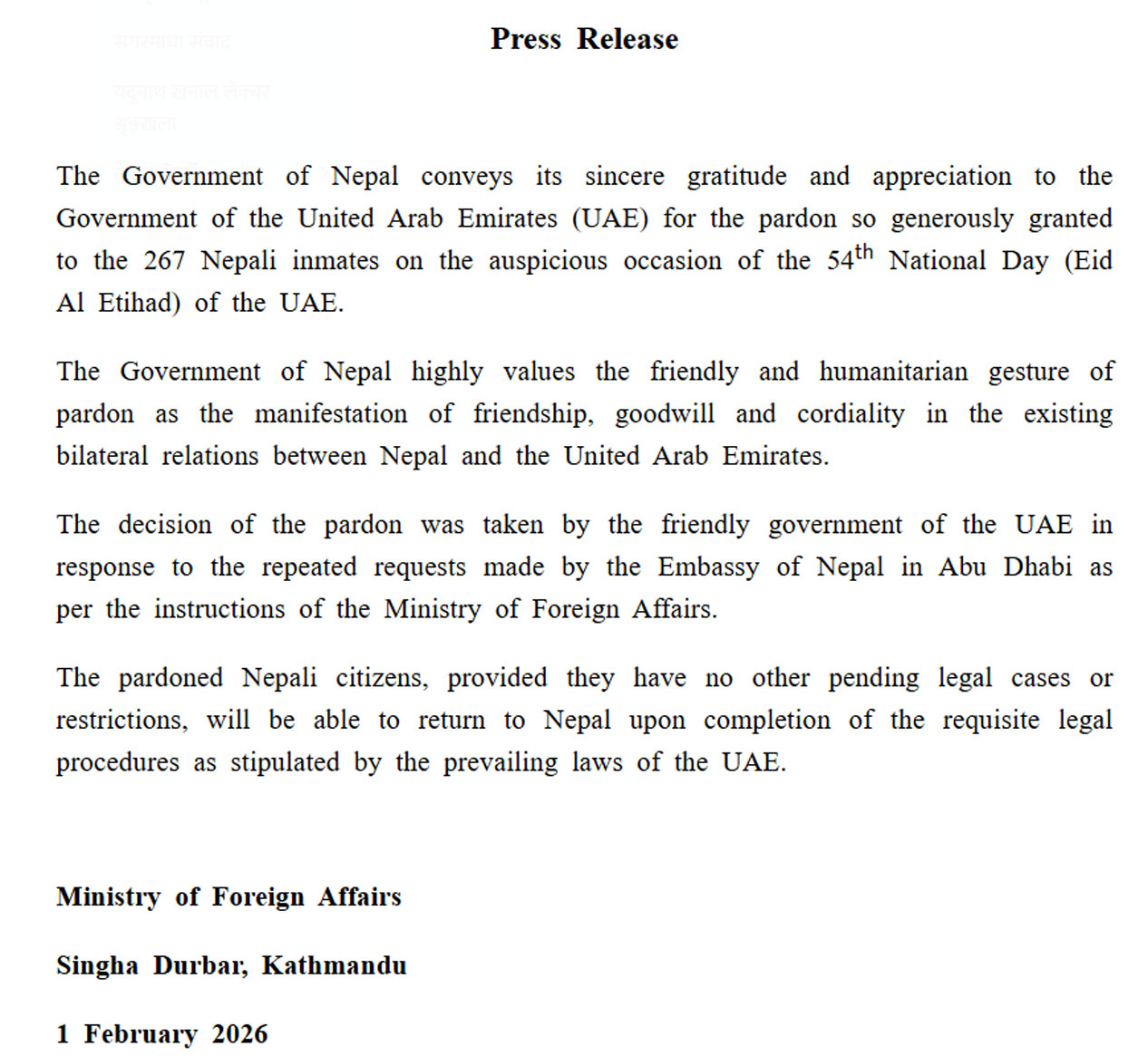 KATHMANDU: The Government of Nepal has expressed sincere gratitude to the United Arab Emirates (UAE) for granting a generous pardon to 267 Nepali inmates on the occasion of the UAE’s 54th National Day.