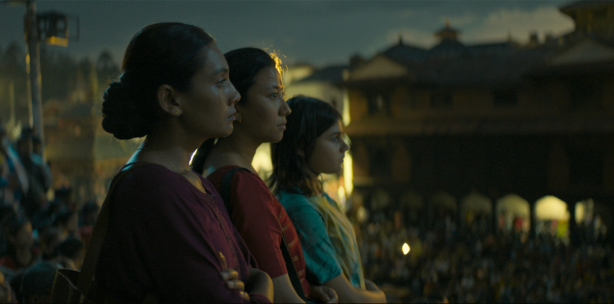 Nine-year-old daughter Lila, played by Polina Oli, and elder sister Maya, who is played by Menuka Pradhan, are Durga’s whole world in the movie. She receives all news of her daughter through her sister. Reaching home tired from the hospital duty, she asks about her daughter’s well-being while smoking a cigarette with Maya. Sitting and stroking past wounds, she is weighed down by the responsibility of raising a daughter. Nevertheless, her life is catching a rhythm in the company of her sister Maya and her daughter.