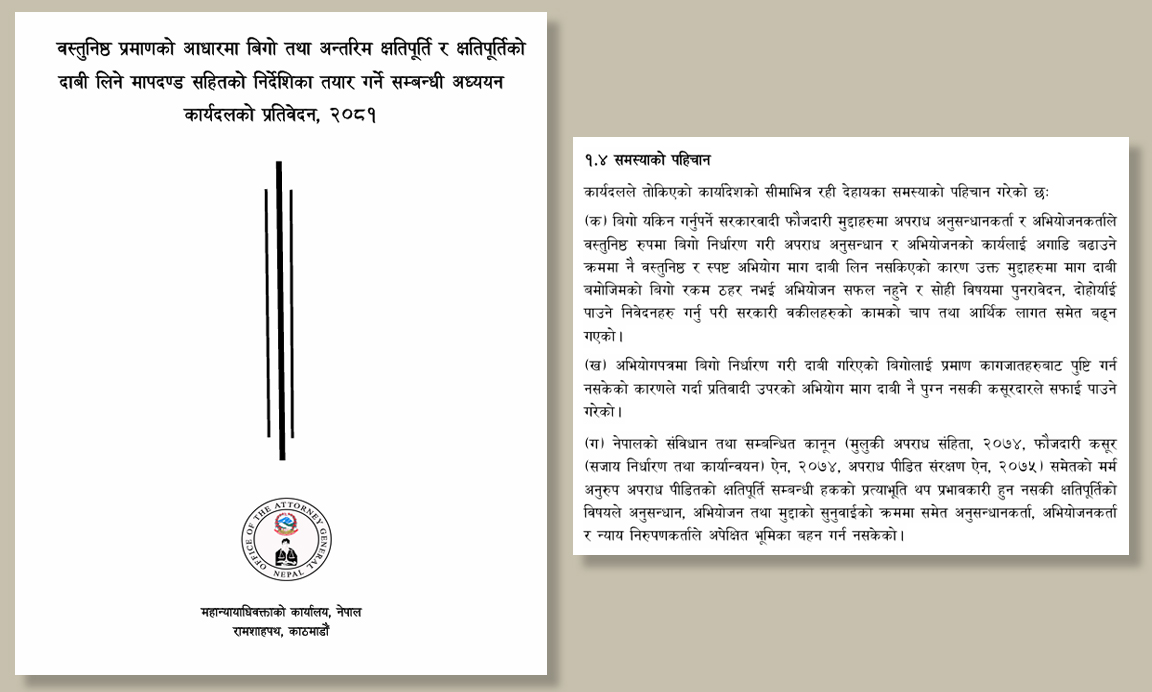 However, cases have repeatedly weakened because compensation is not determined objectively and scientifically. A 2081 BS (2024/25) study report by the Office of the Attorney General on “Compensation and Interim Relief” states that in most cases, charges could not be fully upheld by the courts because the allegations were not objective. The report points out that in criminal cases, compensation amounts often fail to be upheld because they are not made objective and are instead determined based on estimation.