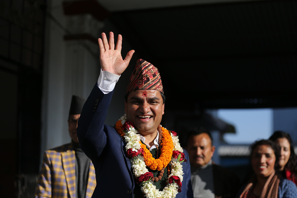 Pradeep Paudel, candidate of the Nepali Congress, after registering his nomination in Kathmandu-5. Photo: Nepal Photo Library.