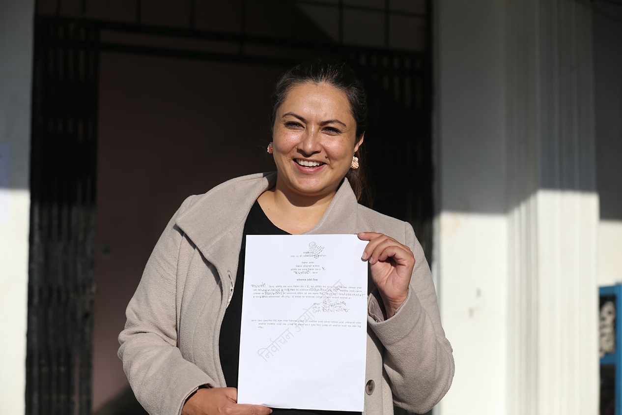 Nisha Adhikari, a leader of the Dynamic Democratic Party, after registering her nomination from Kathmandu-5. Photo: Nepal Photo Library.