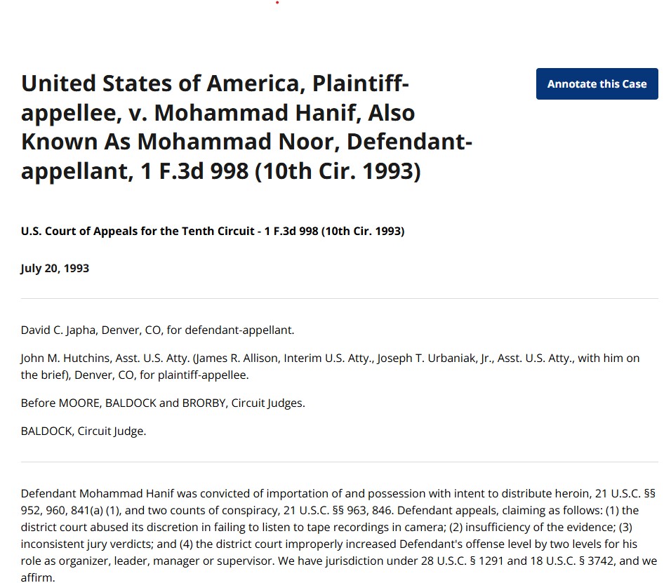 KATHMANDU: On July 20, 1993, Afghan drug trafficker Mohammad Hanif sought a judicial review in the High Court of Denver, Colorado, claiming he had been wrongfully convicted. The Denver District Court had sentenced Hanif, known in the drug world as Mohammad Noor, to 170 months in prison, equivalent to 14 years and two months. Arguing that the lower court’s decision was flawed, he appealed to the High Court. Representing him was David C. Jaffa, a well-known Denver-based attorney.