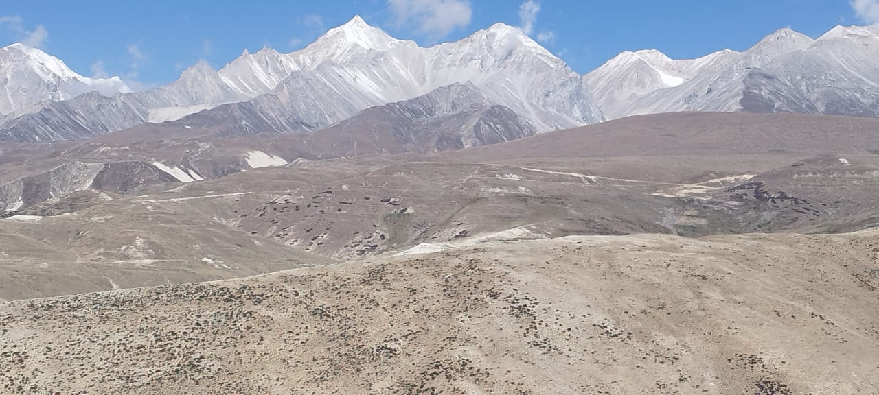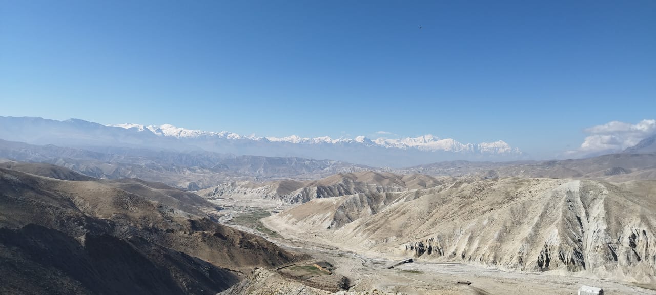 After a journey of about 8-10 kilometers, passing through hills without vegetation, a landscape almost devoid of greenery, but with captivating Himalayan views, we reached near a place called Nhechhung. There is hardly any climb from Lo Manthang to this point; it feels like the car is driving on a flat surface. We saw a stream ahead called Namdok. The surrounding Himalayas were clearly visible. We felt the Himalayas were smiling in welcome.