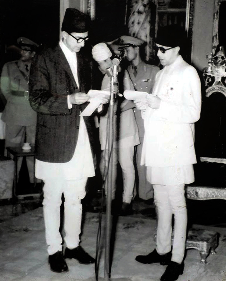 BP Koirala (left) being sworn in by the then King Mahendra (right)