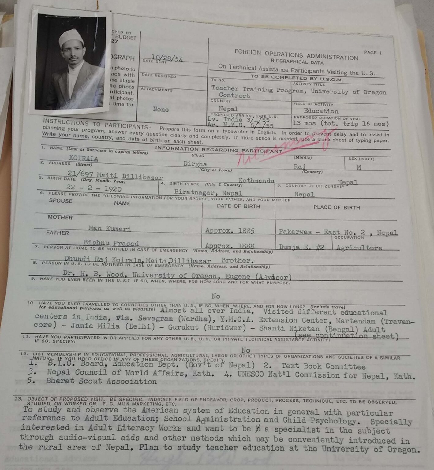Dirgha Raj, who was working as the ‘Chief Inspector of Schools’ in the Department of Education, was also scheduled to go to America for studies. Although he was initially expected to study Teacher Education at the University of Oregon, he later returned to Nepal after obtaining an M.Ed. degree from the University of Ohio. A copy of the application form he filled out and his ‘autobiography’ (autobiography) when he went to study in America is safely preserved in the Hoover Institution Library & Archives at Stanford University in America.