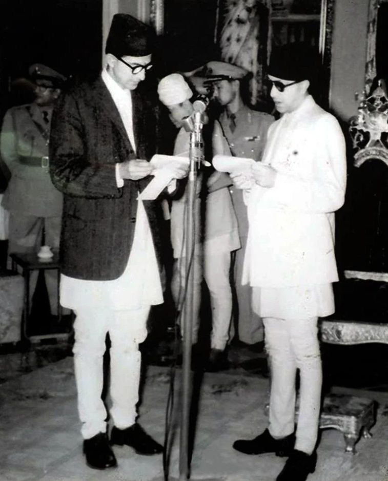 King Mahendra administering the oath of office to the first elected Prime Minister, BP Koirala