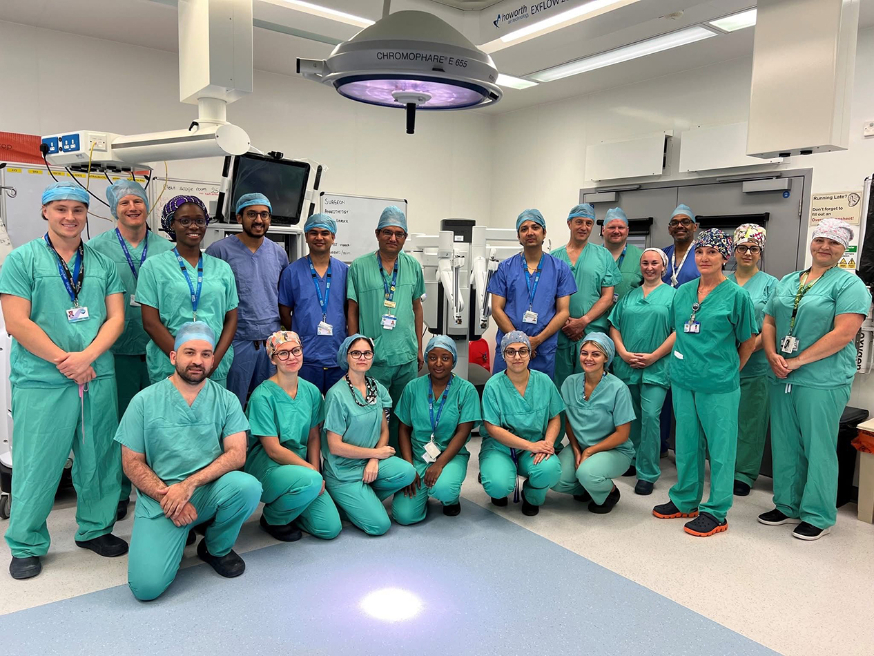 General Surgeon Dr. Lok Kathayat and Senior General Surgeon Dr. Kamal Aryal with the surgical team at James Paget University Hospitals NHS Foundation Trust, UK, prior to performing robotic surgery.