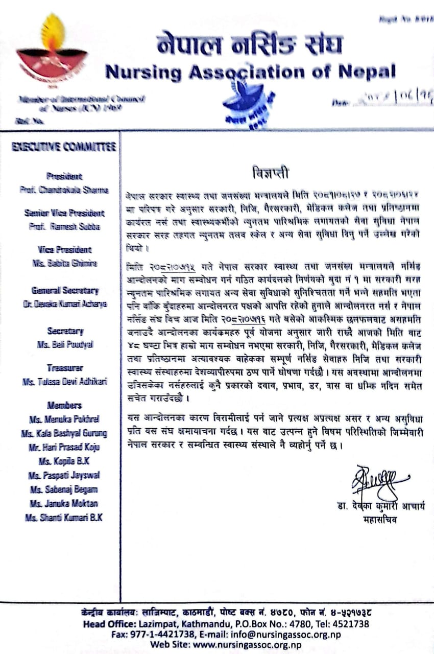 Earlier, on November 1, the Ministry of Health and Population had held talks with the association and agreed to ensure minimum salary parity with government nurses along with other service benefits.