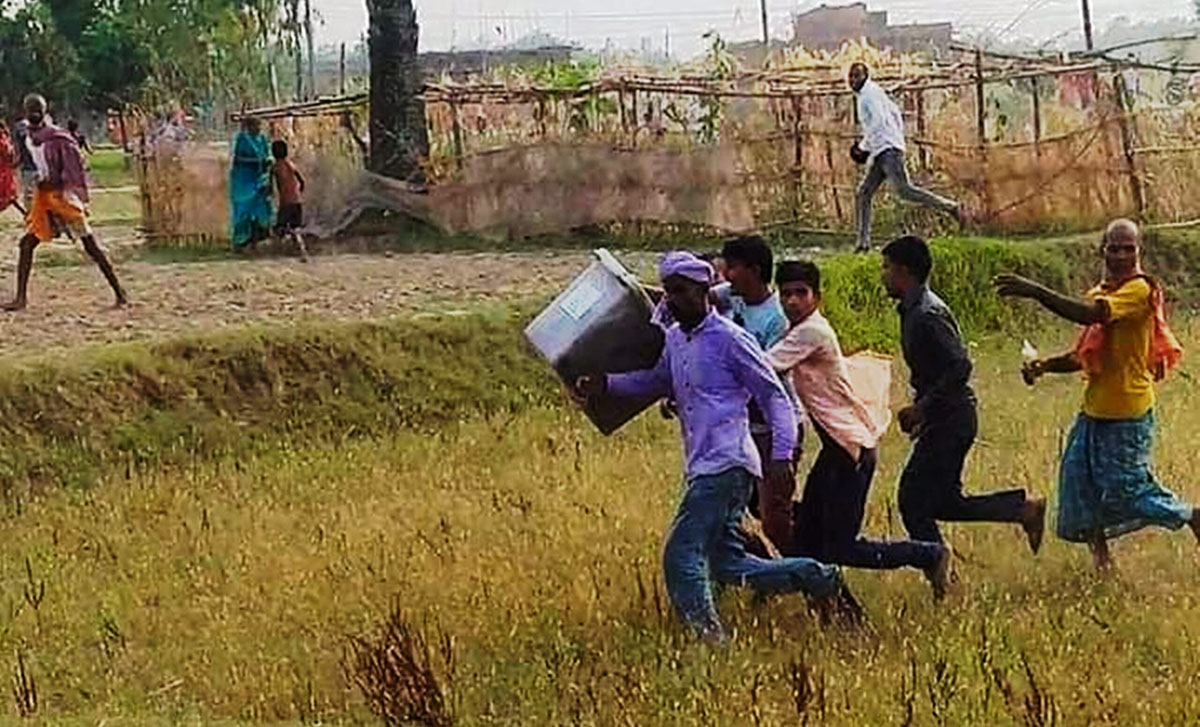Locals of Yamunamai Rural Municipality Ward 2 of Rautahat running away with ballot boxes in the local level elections held on 13 May 2022. Photo: Sanjay Kumar Mishra