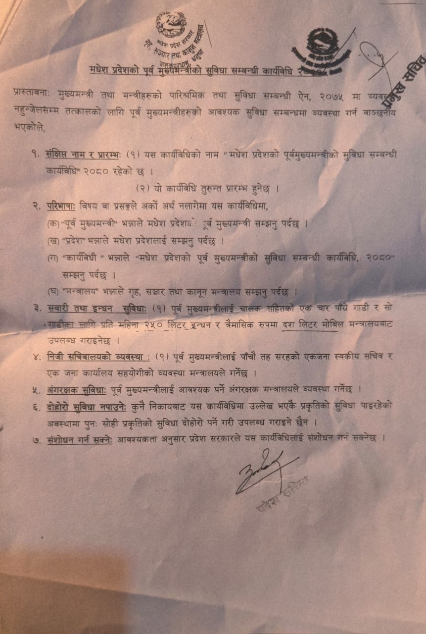JANAKPUR: In Madhesh Province, a set of working procedures was formulated and implemented in the fiscal year 2023/24 to provide facilities to former chief ministers (CMs). The “Procedures Related to Facilities for Former Chief Ministers of Madhesh Province, 2023,” issued by the Ministry of Home, Communications, and Law, outlines provisions for vehicles, fuel, personal secretariats, and bodyguards for all former CMs.