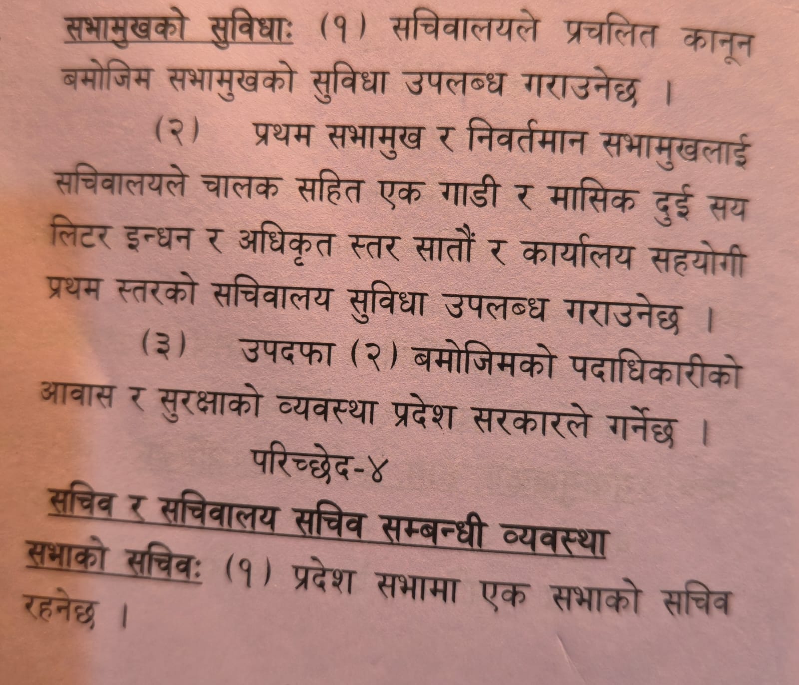 The Madhesh Province Assembly enacted the “Remuneration and Facilities of Officials and Members of the Provincial Assembly Act, 2018,” which provides for the facilities of the Speaker and members of the assembly. Regarding the operation of the Provincial Assembly Secretariat, the”Provincial Assembly Secretariat Act, 2022″ was created. Section 9 (2) of this Act provides for facilities for the first Speaker and the outgoing Speaker. It states that the Provincial Assembly Secretariat will provide both retired officials with a vehicle each, including a driver, 200 liters of fuel monthly, one seventh-level officer, and one office assistant.
