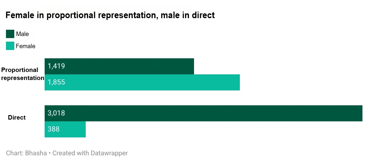 Due to this legal obligation, parties have fielded 1,855 women out of a total of 3,274 candidates for the 110 seats under the proportional representation (PR) system. To win a proportional seat, a party must first become a national party. Only a party that secures three percent of the total valid votes received under the proportional system in the election can send its candidates. Even then, it is difficult for women to be selected through various inclusive methods and systems.