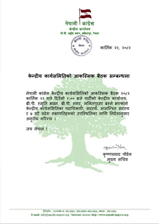 KATHMANDU: The Nepali Congress has called an emergency meeting of its Central Working Committee. According to the party, the meeting has been scheduled for 1 PM today at the party’s central office.