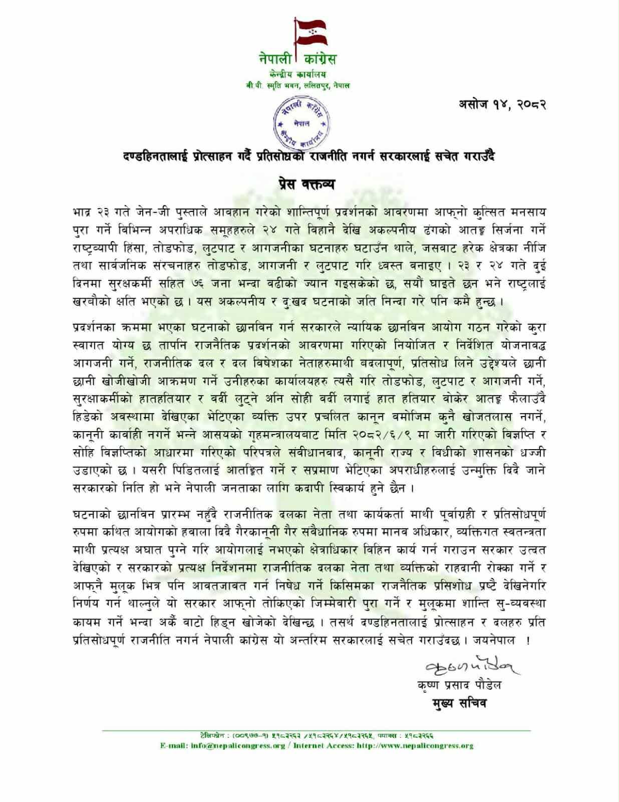 Nepali Congress criticized the move to block passports and restrict domestic travel in the name of forming an inquiry commission, calling it unjust. The statement read, “Without even beginning an investigation into the incident, leaders and activists of political parties are being targeted in a prejudiced and retaliatory manner under the pretext of a so-called commission.