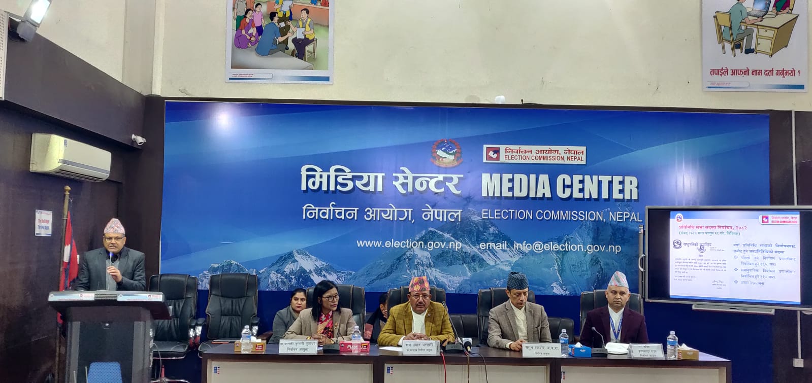 Acting Chief Commissioner Ramprasad Bhandari and others at a press conference organized to provide information about the elections. Photo: Bhasha Sharma