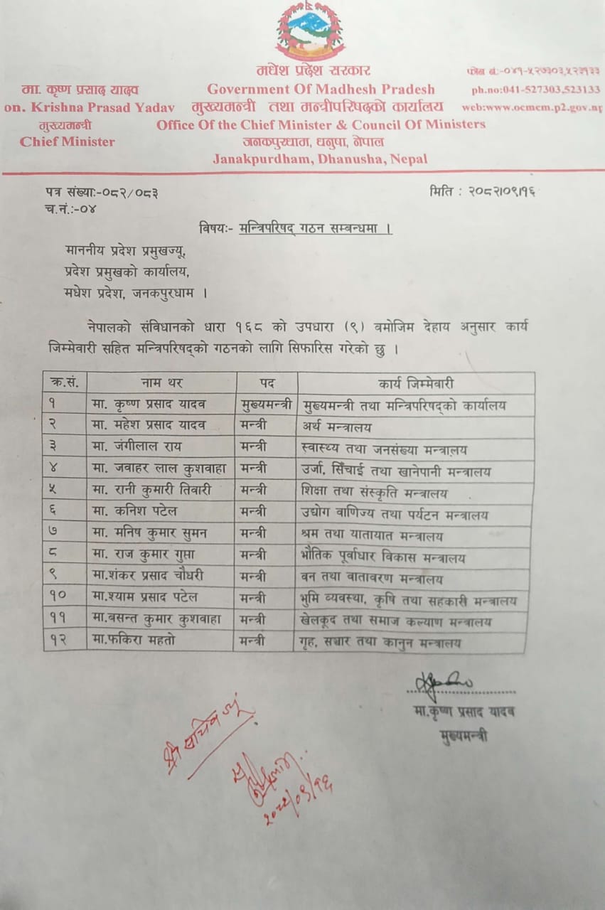KATHMANDU: Madhesh Province Chief Minister Krishna Prasad Yadav finalized his cabinet on Wednesday, expanding the council of ministers for the third time since taking office.