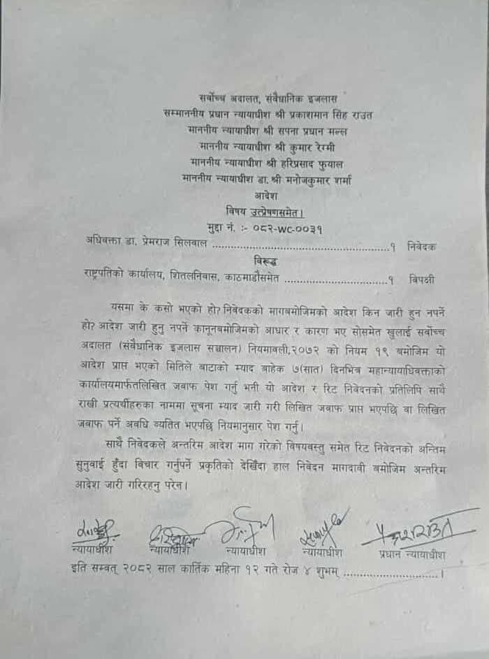 The constitutional bench, led by Chief Justice Prakashman Singh, and including Justices Sapana Pradhan Malla, Kumar Regmi, Hari Phuyal, and Manoj Kumar Sharma, issued the order after a hearing earlier in the day.