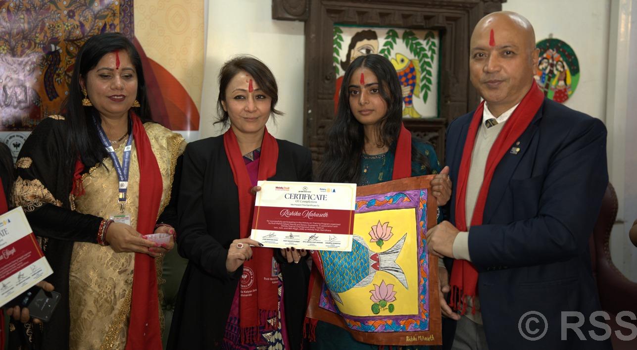 “However, only if art can be linked to a source of income it will be easy to pass it on to future generations,” she said while handing over certificates to the participants of a Mithila Painting Training that concluded here today. Stating that such training is also necessary to link art to income, she expressed special gratitude for this initiative taken to preserve culture.
