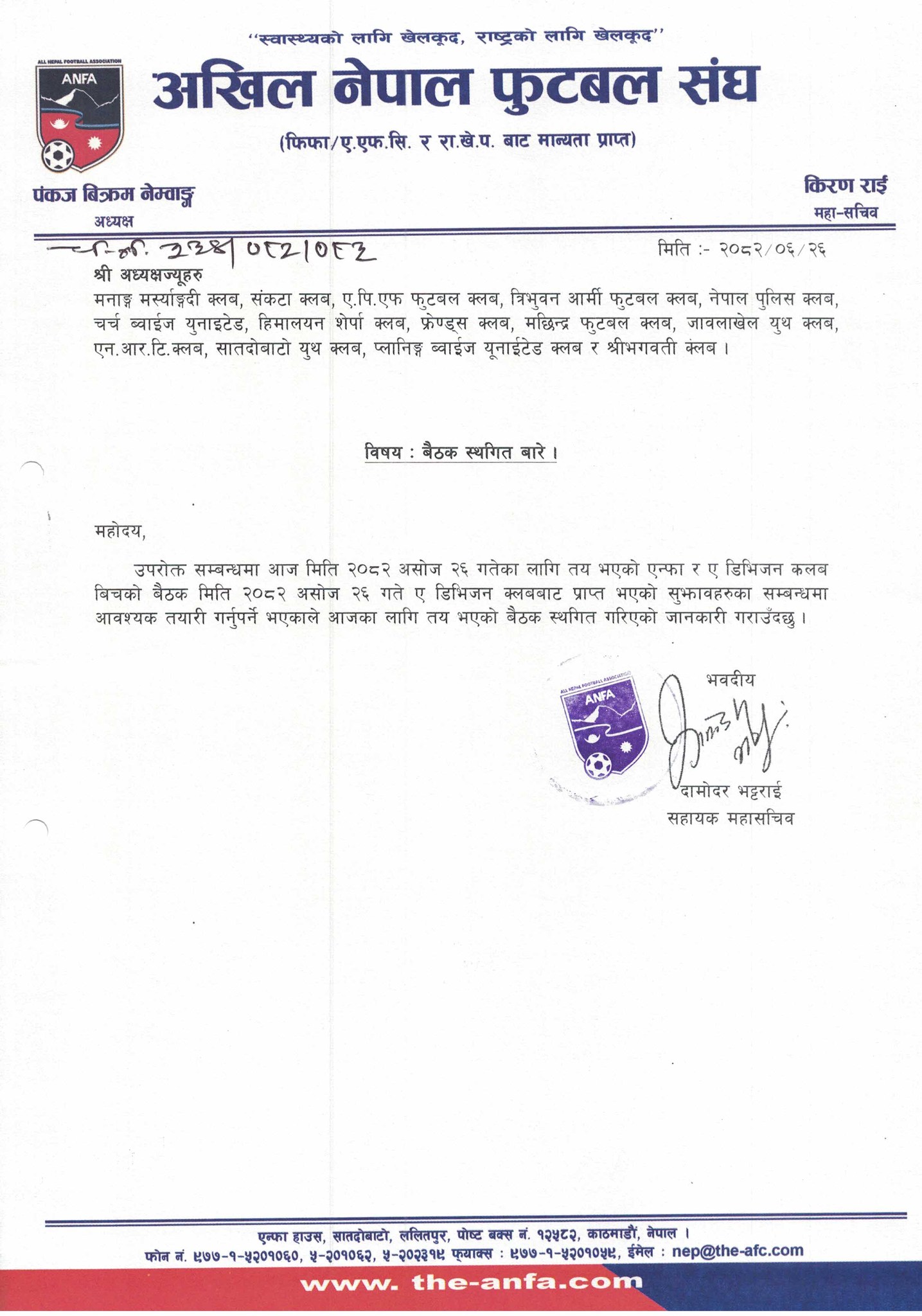 Meanwhile, ANFA had called a meeting today with the 14 participating clubs to discuss organizing the next Martyr’s Memorial League but postponed it at the last moment.