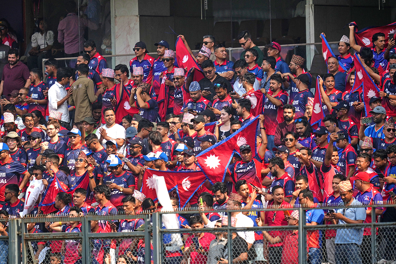 Nepali fans attend the match between Nepal and England at Wankhede Stadium in Mumbai on 8 Feb. Photo: AP Photo/RSS