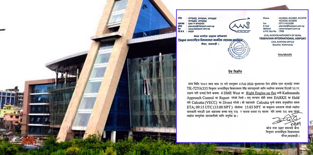 KATHMANDU: The Turkish Airlines rerouted its flight and landed safely in Kolkata, India after noticing a signal of fire in its right engine on Wednesday.